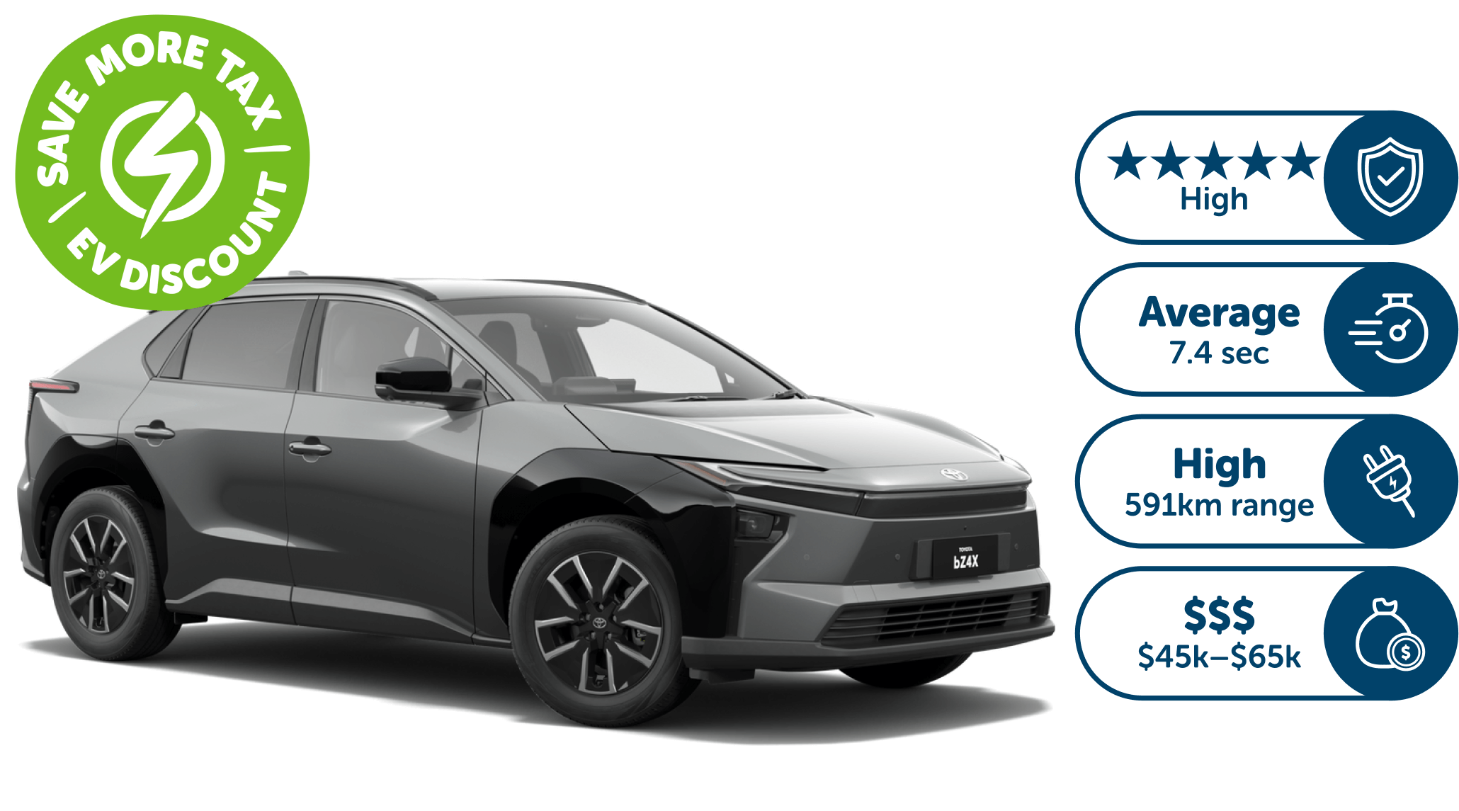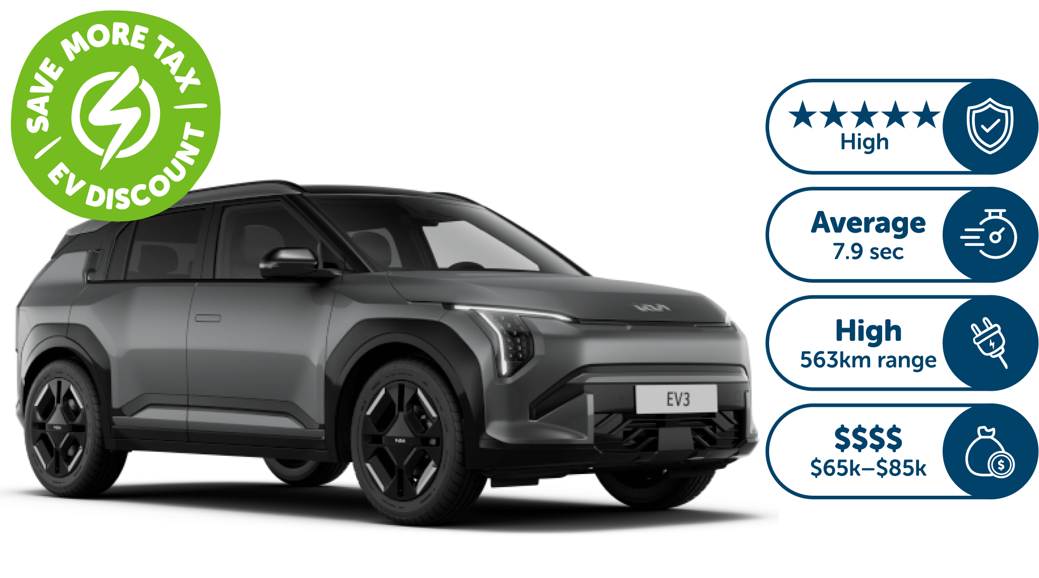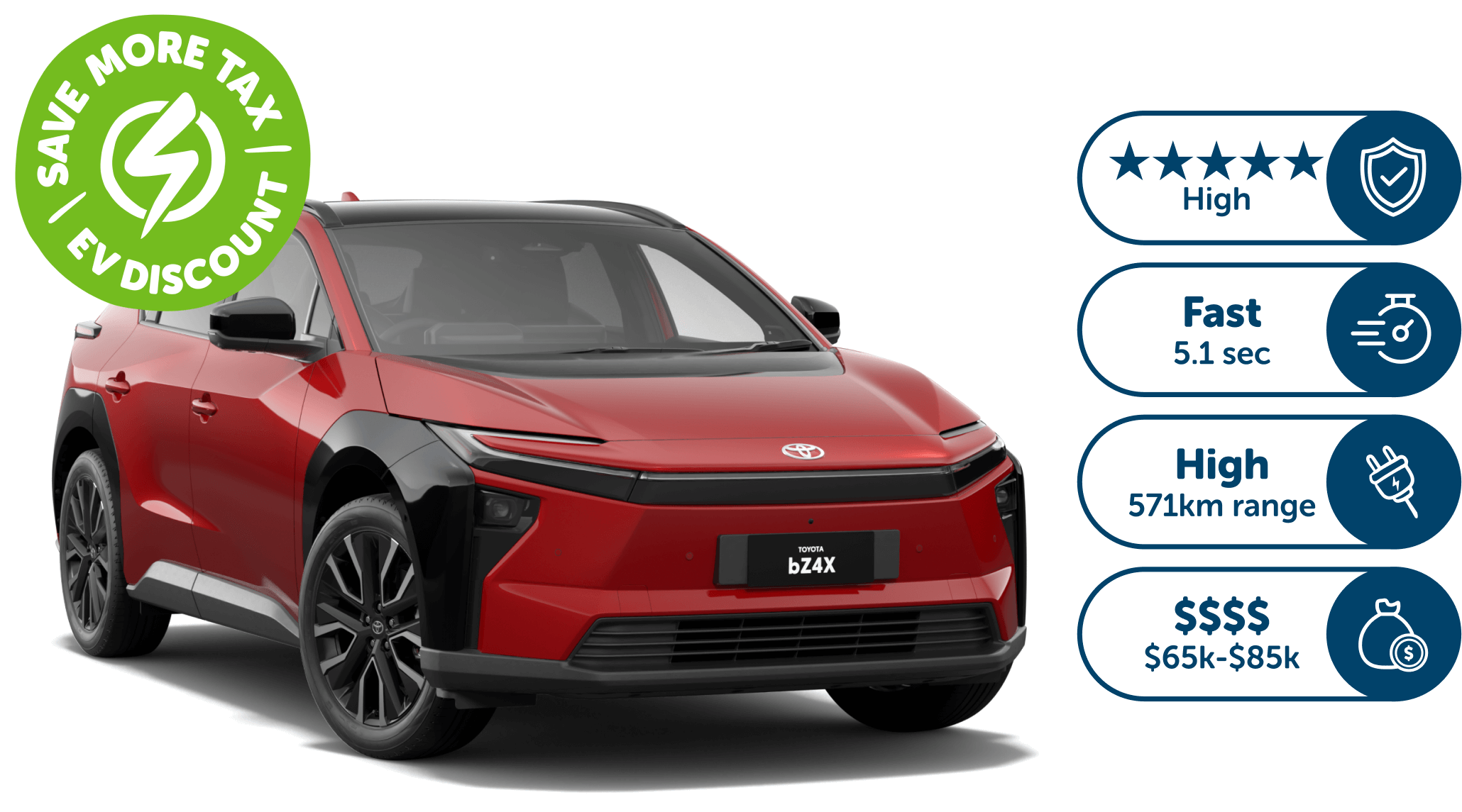 ^Metric: Vehicle Type (Petrol, Petrol Hybrid, Diesel, Diesel Hybrid, Plug-in Hybrid, Electric)Safety ANCAP Rating (0 stars = Poor, 1-2 stars = Low, 3-4 stars = Adequate, 5 stars = High)Acceleration 0-100km/h performance (Over 9 seconds = Slow, 7-8.9 seconds = Average, Under 6.9 seconds = Fast)Fuel Efficiency (12L/100km and up = Poor, 9 - 11.9L/100km = Average, Under 8.9L/100km = Good)EV Range (Under 300km = Low, 300-500km = Mid, Over 500km - High)Price Range (Under $25k = $, $25k - $45k = $$, $45k - $65k = $$$, $65k - $85k = $$$$, Over $85k = $$$$$).